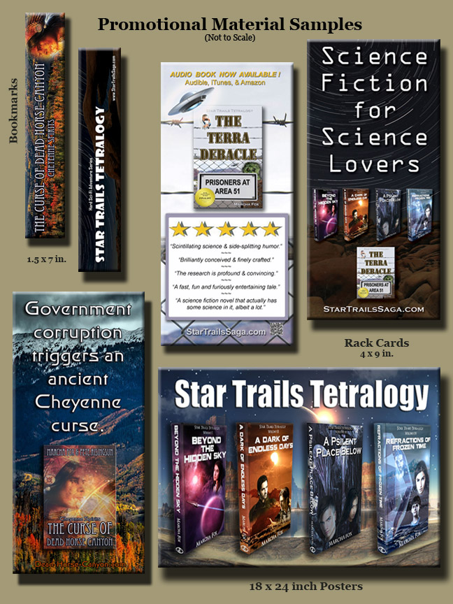 - Order 2 copies each of the Star Trail Tetralogy (STT) (Beyond the Hidden Sky, A Dark of Endless Days, A Psilent Place Below, Refractions of Frozen Time, plus The Terra Debacle: Prisoners at Area 51 (TDPA51) (a total of 10 books) and 5 copies of The Curse of Dead Horse Canyon: Cheyenne Spirits (CDHC) and Return to Dead Horse Canyon: Grandfather Spirits, and we’ll provide 25 rack cards for CDHC, TDPA51, & STT as well as 25 bookmarks for CDHC.